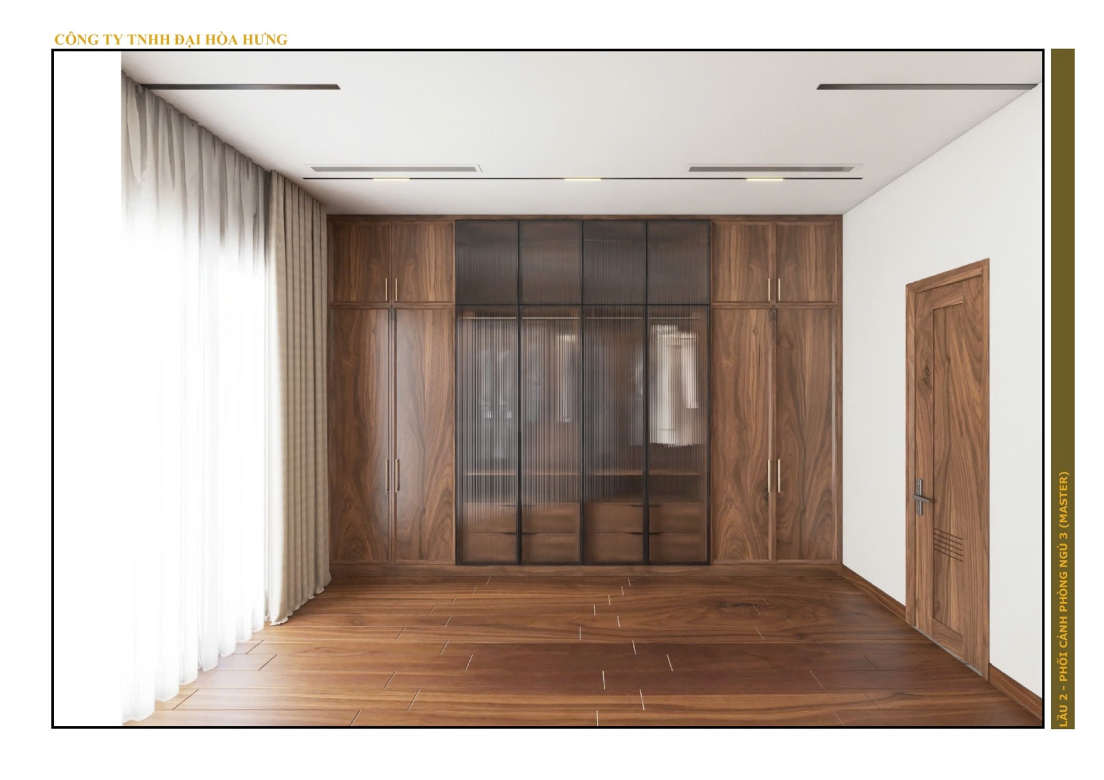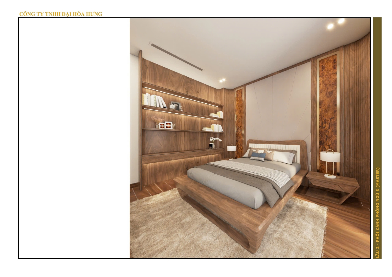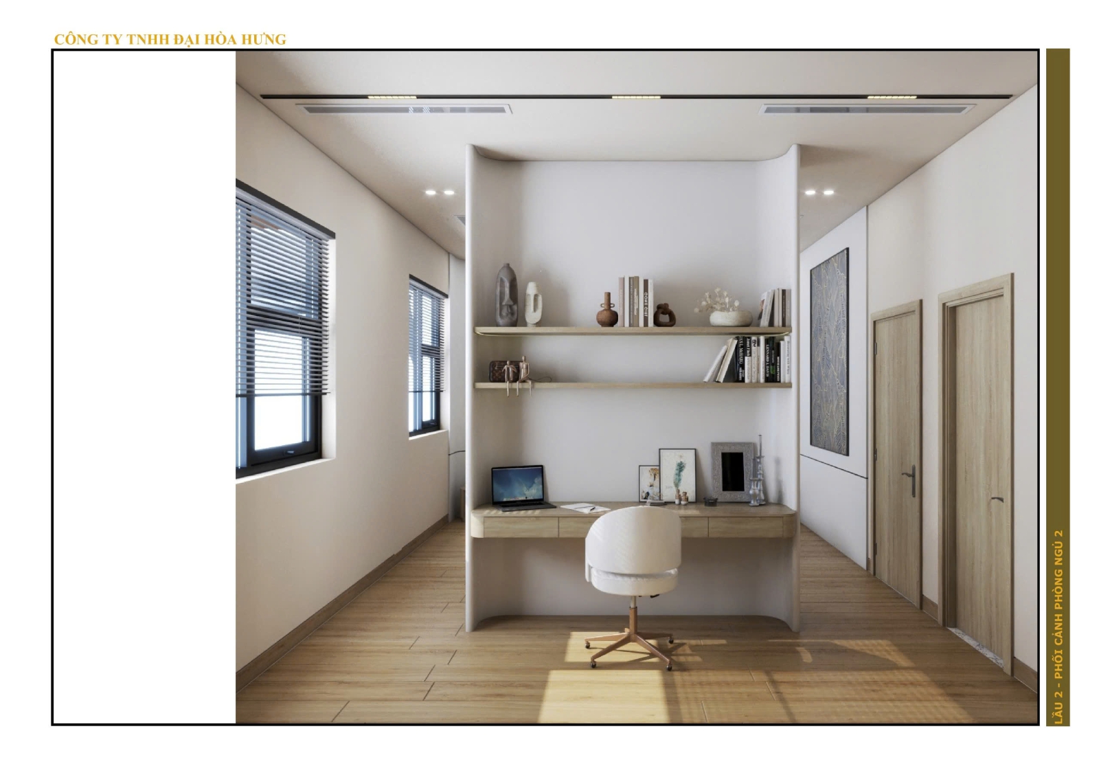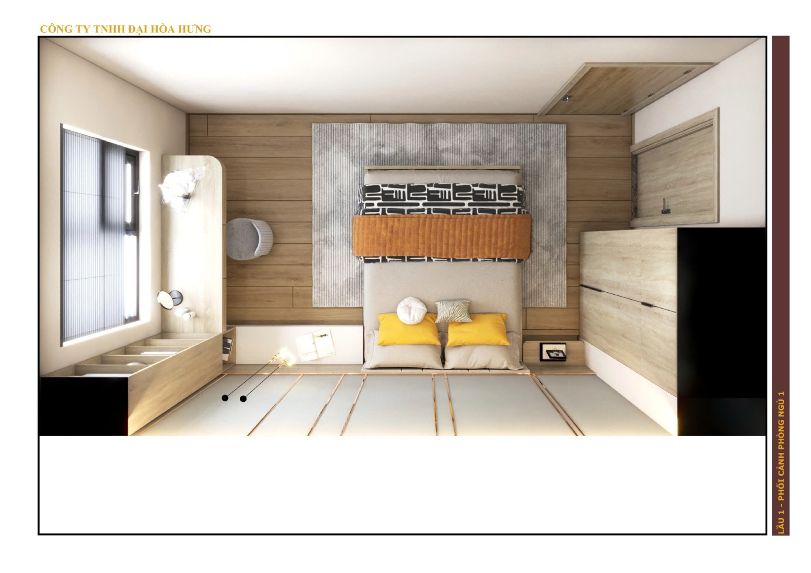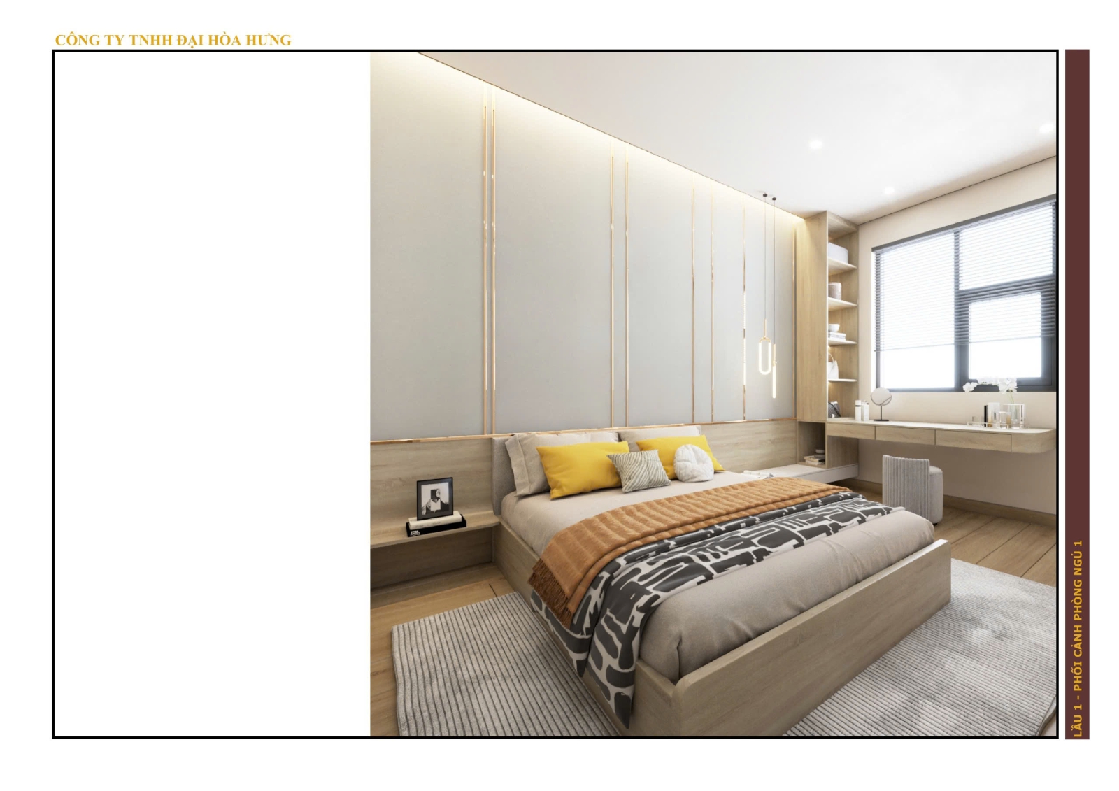 - Lầu 1: Phòng ngủ master (kèm phòng thay đồ, vệ sinh riêng), phòng làm việc/reading room.